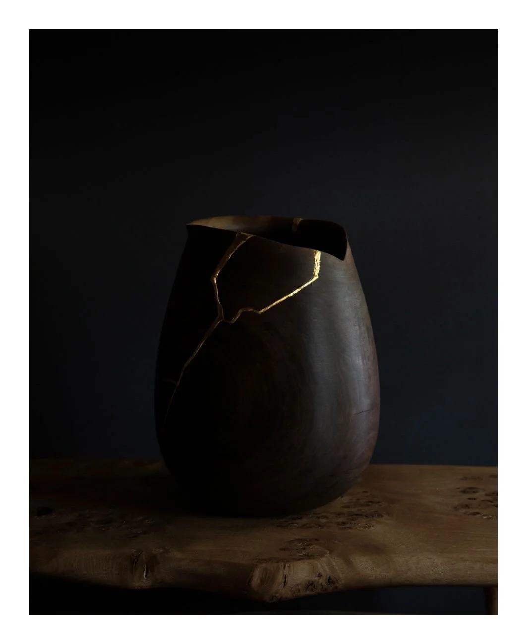 Bobby, using a specially made support for his lathe turned two very large and beautiful walnut vessels, these were naturally dried to a point of cracking and given to me to repair using the art form of Kintsugi or ‘golden seams/scars’. In the case of these two vessels ; resin, gold skewings and 24kt gold leaf have bound the broken pieces together, It’s a tricky technique that involves dexterity and a lot of time and patience.